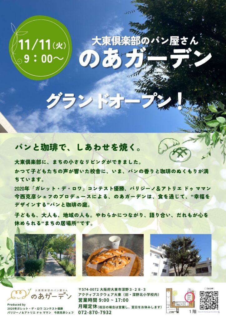 のあガーデン グランドオープン 投稿者:noahgarden001@gmail.com 投稿公開日:2025年11月9日 投稿カテゴリー:お知らせ 2025年11月11日(火) 9:00~ 大東倶楽部のパン屋さん「のあガーデン」がオープンいたします! 皆様のご来店をお待ちしております